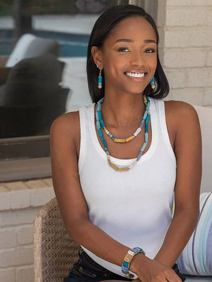 of jewelry. The wooden beads are scraps sourced from furniture factories nearby, and the fabric used to cover